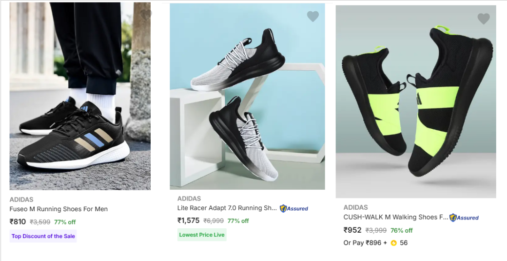 Adidas Men's Shoes upto 77% Discount | Starting at ₹810 available online in India at an offer price of ₹810 on Flipkart. Discounted Price: ₹810. This deal was updated by @radhika on 11th October, 2025 at 10:44 AM.
