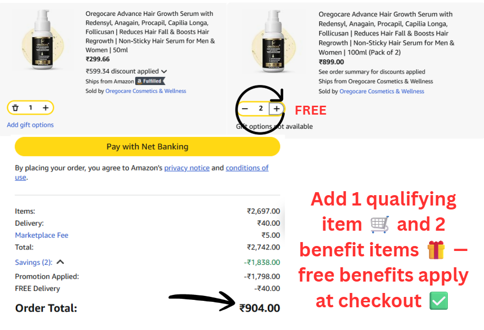 Add 1 qualifying item 🛒 and 2 benefit items 🎁 — free benefits apply at checkout ✅