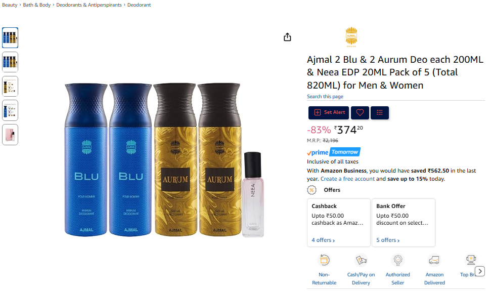 Ajmal 2 Blu & 2 Aurum Deo each 200ML & Neea EDP 20ML Pack of 5 (Total 820ML) for Men & Women.