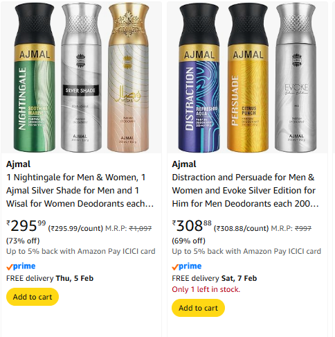 Ajmal Deodorants [pack of 3] Starting @ ₹295 on Amazon.