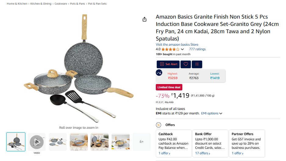 Amazon Basics Granite Finish Non Stick 5 Pcs Induction Base Cookware Set-Granito Grey (24cm Fry Pan, 24 cm Kadai, 28cm Tawa and 2 Nylon Spatulas).