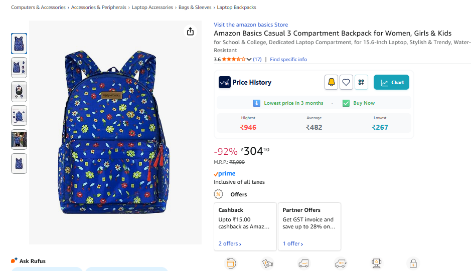 amazon basics Casual 3 Compartment Backpack for School & College | Dedicated Laptop Compartment for 15.6-Inch Laptop | Stylish & Trendy | for Women, Girls & Kids | Water-Resistant.