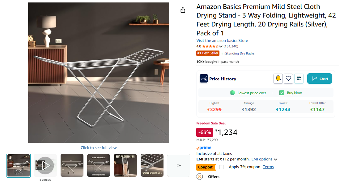 Amazon Basics Premium Mild Steel Cloth Drying Stand - 3 Way Folding, Lightweight, 42 Feet Drying Length, 20 Drying Rails (Silver), Pack of 1