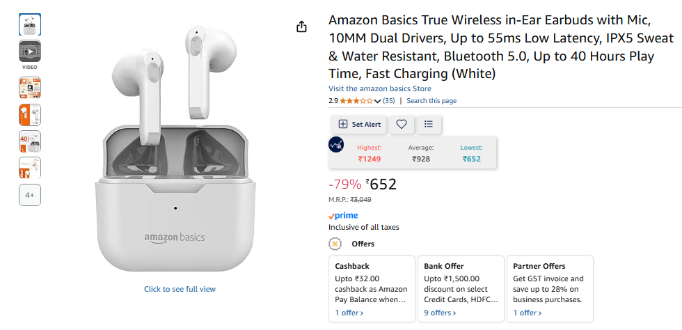Amazon Basics True Wireless in-Ear Earbuds with Mic, 10MM Dual Drivers, Up to 55ms Low Latency, IPX5 Sweat & Water Resistant, Bluetooth 5.0, Up to 40 Hours Play Time, Fast Charging (White)