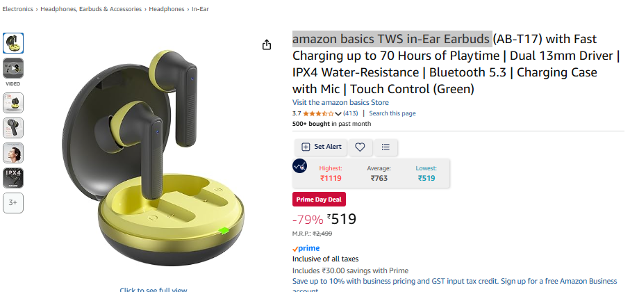 amazon basics TWS in-Ear Earbuds (AB-T17) with Fast Charging up to 70 Hours of Playtime | Dual 13mm Driver | IPX4 Water-Resistance | Bluetooth 5.3 | Charging Case with Mic | Touch Control (Green) is available on Amazon.