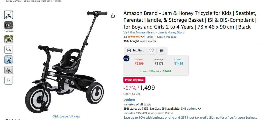 Amazon Brand - Jam & Honey Tricycle for Kids | Seatblet, Parental Handle, & Storage Basket | ISI & BIS-Compliant | for Boys and Girls 2 to 4 Years | 73 x 46 x 90 cm | Black