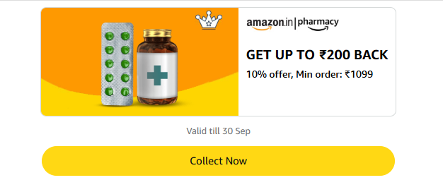 Amazon is running an offer on "Pharmacy" where you will get Upto ₹200 Cashback on Pharmacy.