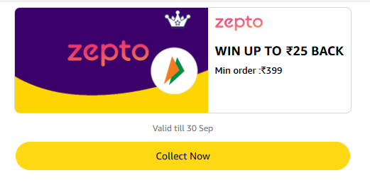 Amazon is running an offer on "Zepto" where you will get Upto ₹25 Cashback on Zepto.