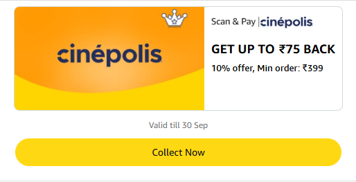 Amazon Rewards : Upto ₹75 Cashback on Cinepolis available online in India on Amazon. Offer Note: Valid till 30th September 2025. This deal was updated by @radhika on 19th September, 2025 at 5:59 PM.