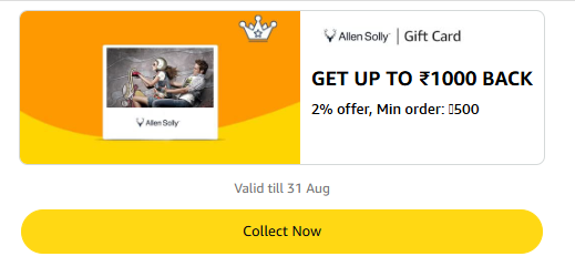 Amazon Rewards : Upto ₹1000 Cashback on Allen Solly Gift Card available online in India on Amazon. Offer Note: Valid till 31st August 2025. This deal was updated by @radhika on 24th August, 2025 at 6:17 PM.