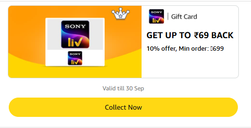 Amazon Rewards : 10% Cashback on SonyLiv Gift Cards (Up to ₹69) available online in India on Amazon. Offer Note: Valid till 30th September 2025. This deal was updated by @radhika on 01st September, 2025 at 10:16 AM.