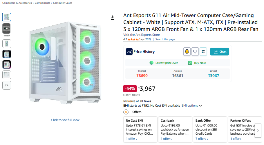 Ant Esports 611 Air Mid-Tower Computer Case/Gaming Cabinet - White | Support ATX, M-ATX, ITX | Pre-Installed 3 x 120mm ARGB Front Fan & 1 x 120mm ARGB Rear Fan.