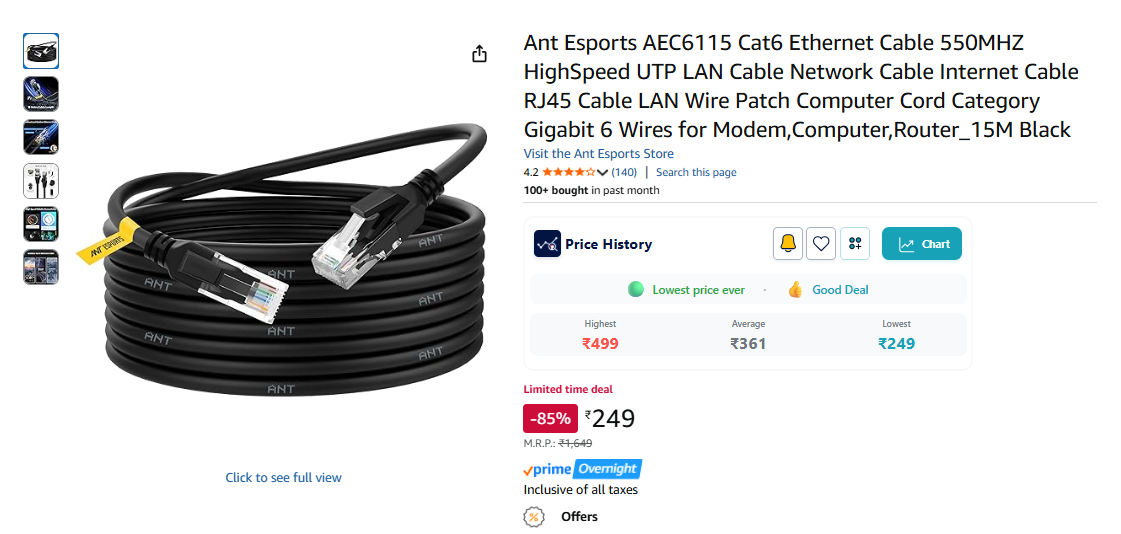 Ant Esports AEC6115 Cat6 Ethernet Cable 550MHZ HighSpeed UTP LAN Cable Network Cable Internet Cable RJ45 Cable LAN Wire Patch Computer Cord Category Gigabit 6 Wires for Modem,Computer,Router_15M Black