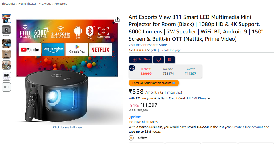 Ant Esports View 811 Smart LED Multimedia Mini Projector for Room (Black) | 1080p HD & 4K Support, 6000 Lumens | 7W Speaker | WiFi, BT, Android 9 | 150.
