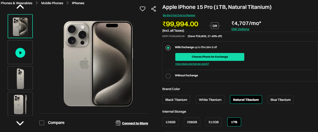 Apple iPhone 15 Pro (1TB, Natural Titanium).