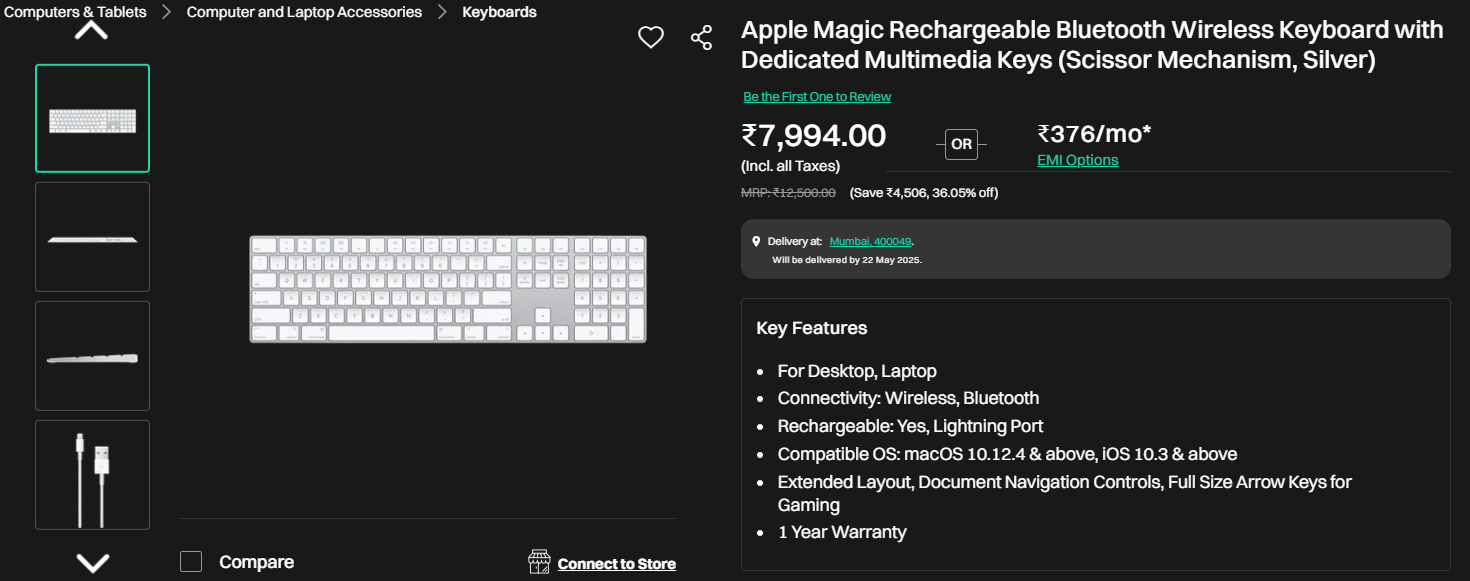 Apple Magic Rechargeable Bluetooth Wireless Keyboard with Dedicated Multimedia Keys (Scissor Mechanism, Silver).