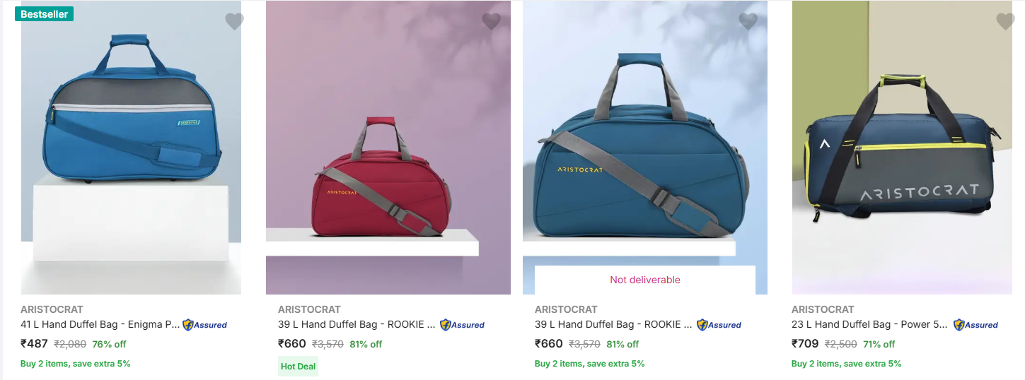 Aristocrat Duffel Bags upto 81% Discount is available on Flipkart.
