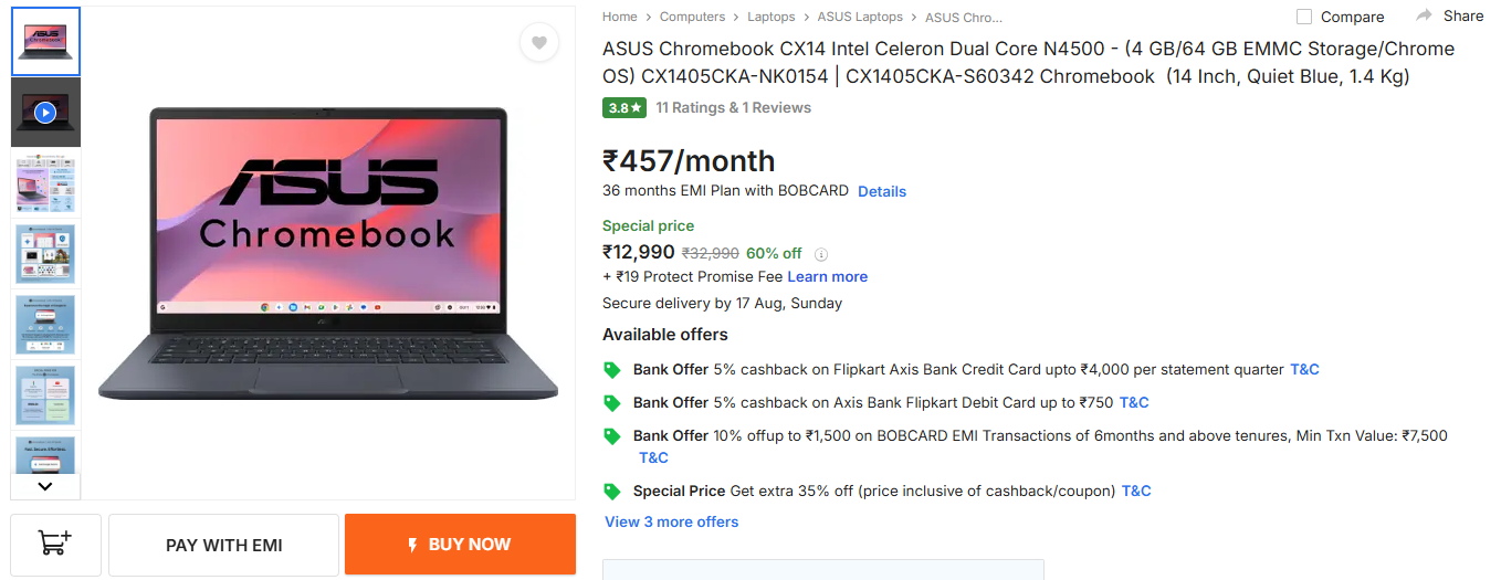 ASUS Chromebook CX14 Intel Celeron Dual Core N4500 - (4 GB/64 GB EMMC Storage/Chrome OS) CX1405CKA-NK0154 | CX1405CKA-S60342 Chromebook (14 Inch, Quiet Blue, 1.4 Kg).