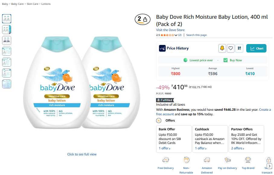 Baby Dove Rich Moisture Baby Lotion, 400 ml (Pack of 2).