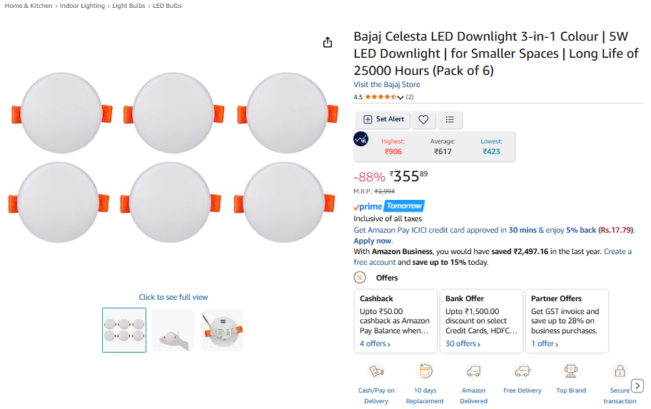 Bajaj Celesta LED Downlight 3-in-1 Colour | 5W LED Downlight | for Smaller Spaces | Long Life of 25000 Hours (Pack of 6).