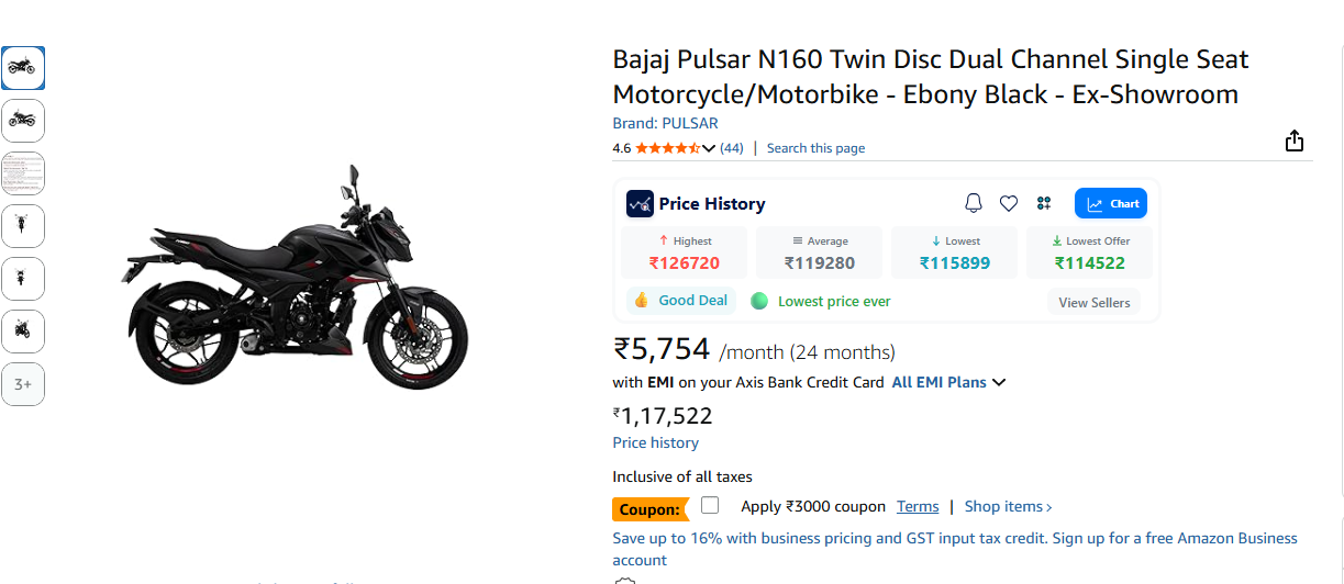 Bajaj Pulsar N160 Twin Disc Dual Channel Single Seat Motorcycle/Motorbike - Ebony Black - Ex-Showroom