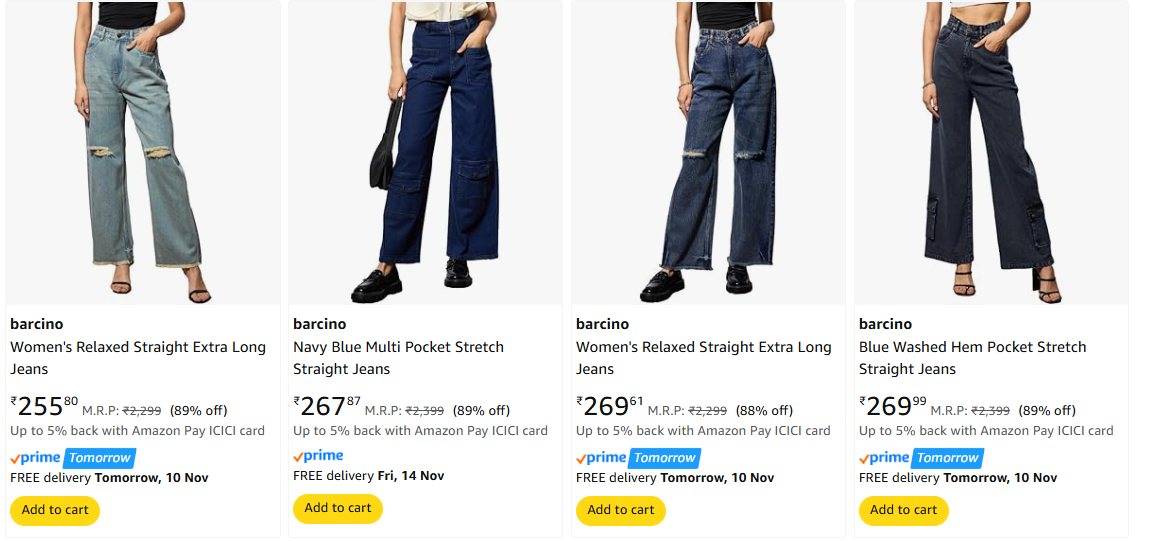 Barcino Women's Jeans upto 89% Discount | Starting at ₹255 available online in India at an offer price of ₹255 on Amazon. Discounted Price: ₹255. This deal was updated by @radhika on 09th November, 2025 at 5:23 PM.