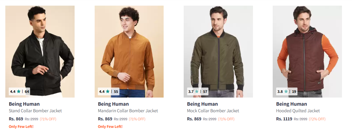 Being Human Men's Jackets at minimum 70% Discount is available on Myntra.