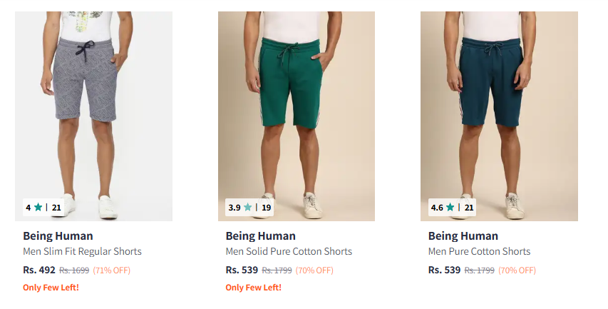 Being Human Men's Shorts at minimum 70% Discount is available on Myntra.