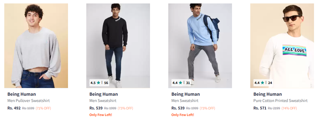 Being Human Men's Sweatshirts upto 74% Discount is available on Myntra.