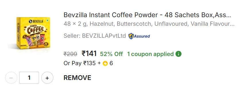 Bevzilla Instant Coffee Powder - 48 Sachets Box,Assorted Flavour,12 Sachets Each Flavour Instant Coffee (48 x 2 g, Hazelnut, Butterscotch, Unflavoured, Vanilla Flavoured).