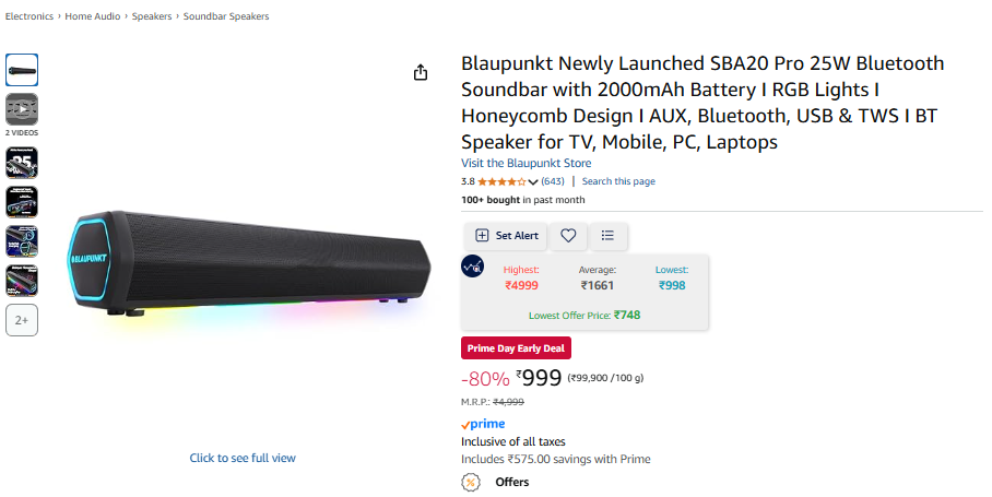 Blaupunkt Newly Launched SBA20 Pro 25W Bluetooth Soundbar with 2000mAh Battery I RGB Lights I Honeycomb Design I AUX, Bluetooth, USB & TWS I BT Speaker for TV, Mobile, PC, Laptops.