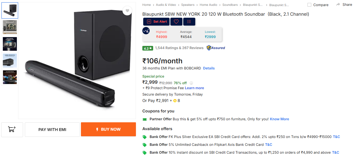 Blaupunkt SBW NEW YORK 20 120 W Bluetooth Soundbar (Black, 2.1 Channel).
