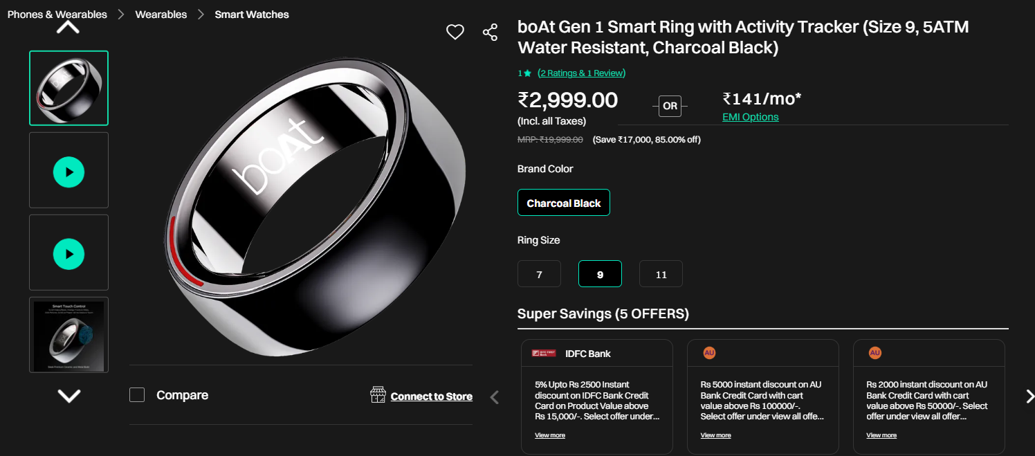 boAt Gen 1 Smart Ring with Activity Tracker (Size 9, 5ATM Water Resistant, Charcoal Black).