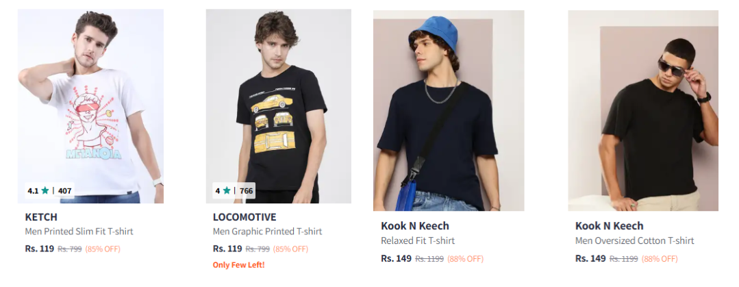 Branded Men's T-shirts upto 89% Discount | Starting at ₹119 is available on Myntra.