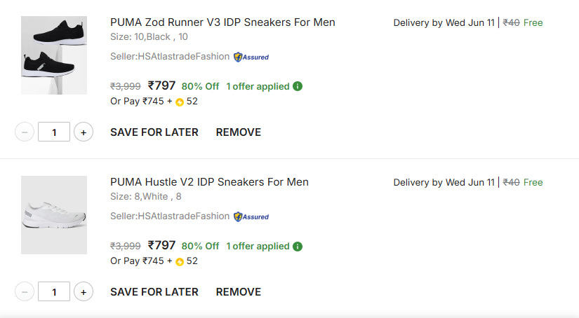 Add any 2 shoes to the cart and make a 2k+ cart to get 500 off and get both shoes for around 1600 only.