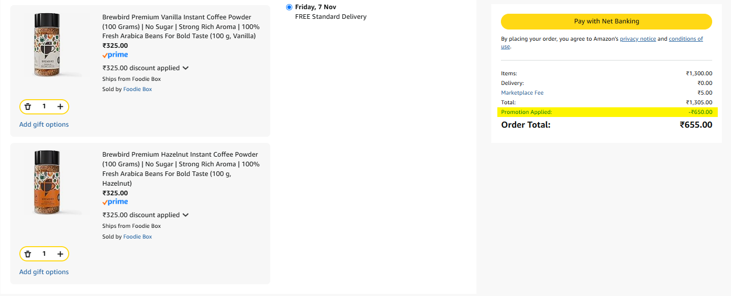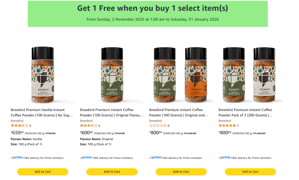 Brewbird Coffee Powder Buy 1 Get 1 Free is available on Amazon.