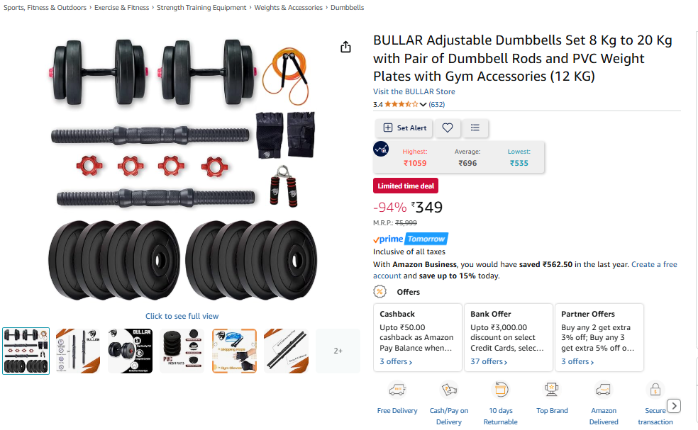 BULLAR Adjustable Dumbbells Set 8 Kg to 20 Kg with Pair of Dumbbell Rods and PVC Weight Plates with Gym Accessories (12 KG).