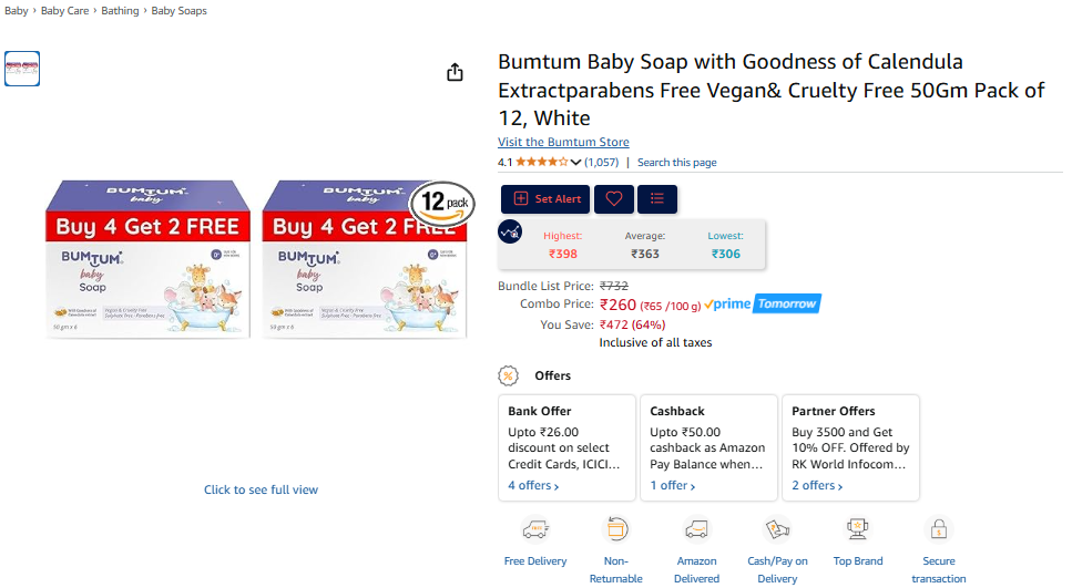 Bumtum Baby Soap with Goodness of Calendula Extractparabens Free Vegan& Cruelty Free 50Gm Pack of 12, White.