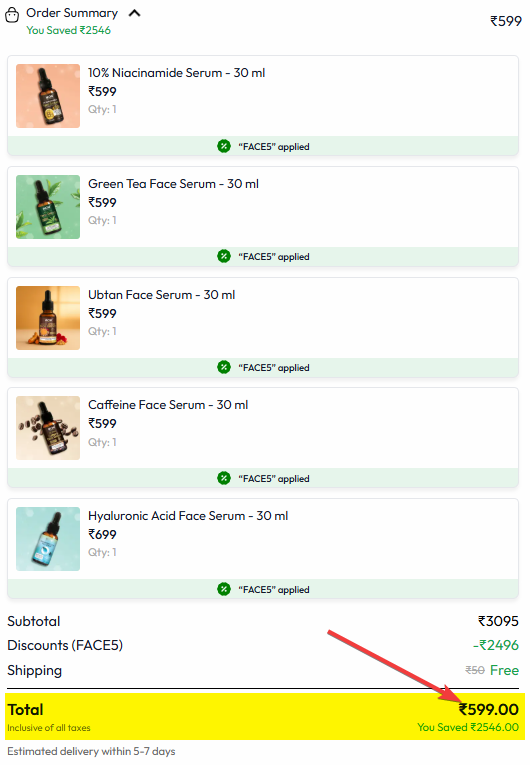 Add any 5 products to the carts for Auto Apply Coupon (FACE5) and the price is ₹599 only.