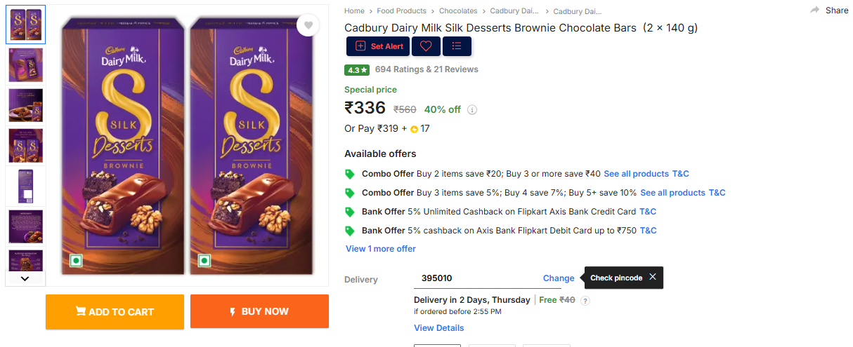 Cadbury Dairy Milk Silk Desserts Brownie Chocolate Bars (2 x 140 g).