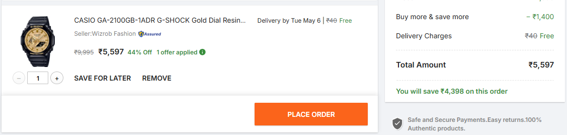 CASIO G-SHOCK Gold Dial Resin Strap Analog-Digital Watch - For Men G1453 (GA-2100GB-1ADR)