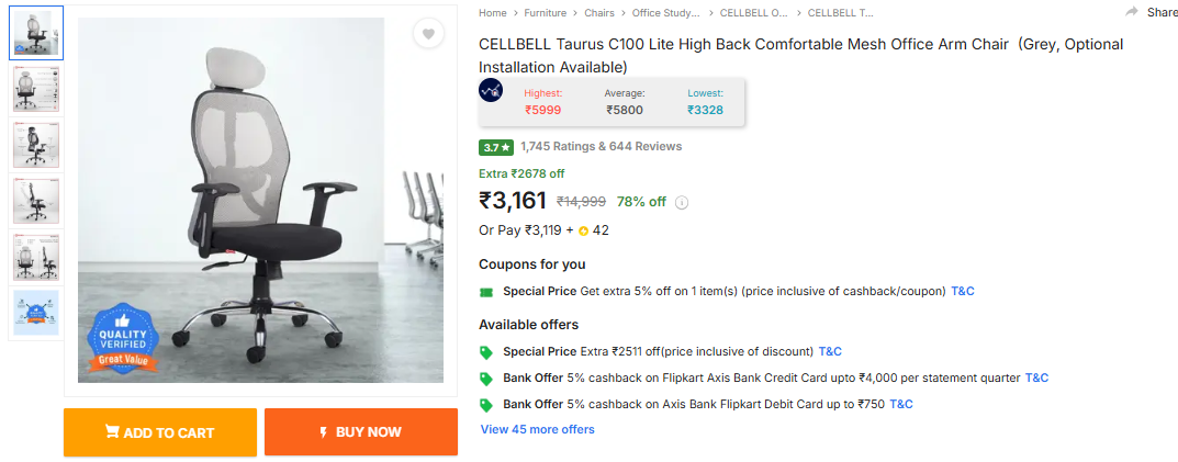 CELLBELL Taurus C100 Lite High Back Comfortable Mesh Office Arm Chair (Grey, Optional Installation Available).