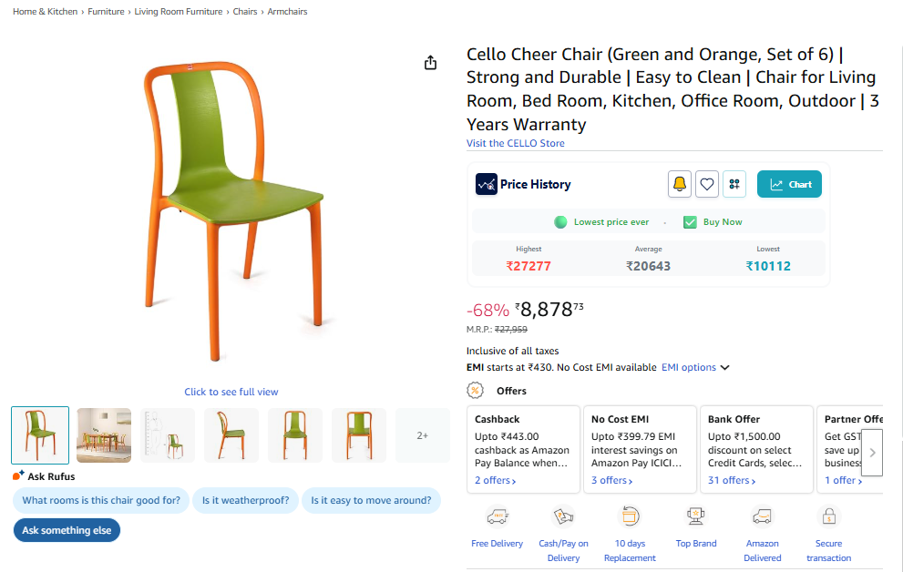 Cello Cheer Chair (Green and Orange, Set of 6) | Strong and Durable | Easy to Clean | Chair for Living Room, Bed Room, Kitchen, Office Room, Outdoor | 3 Years Warranty