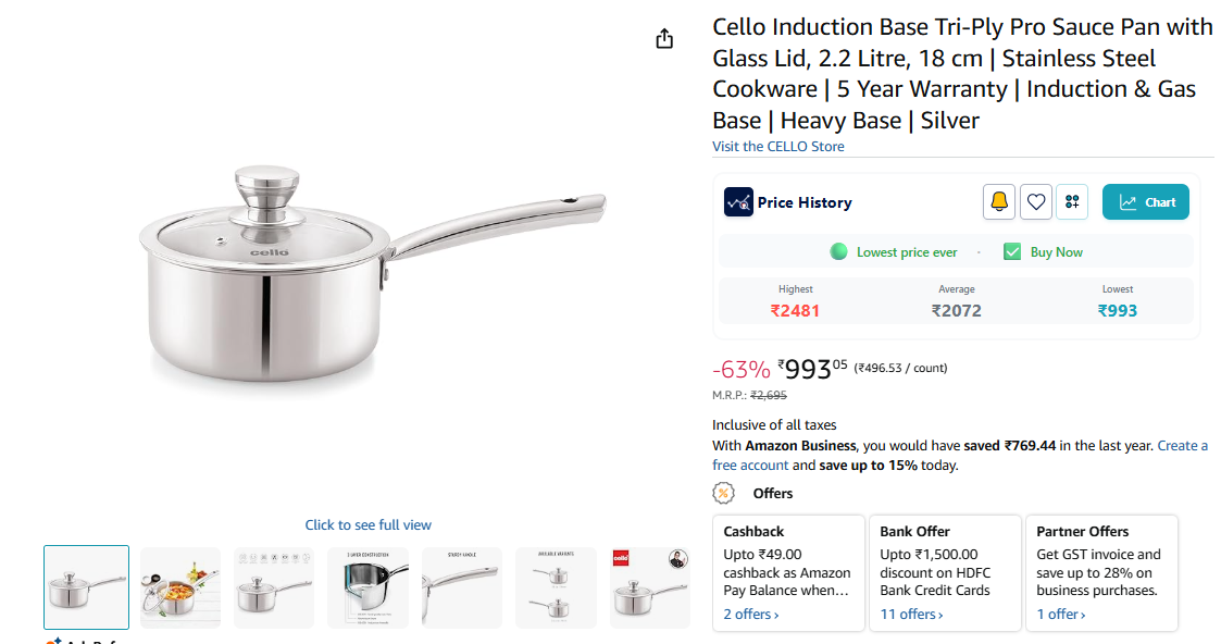 Cello Induction Base Tri-Ply Pro Sauce Pan with Glass Lid, 2.2 Litre, 18 cm | Stainless Steel Cookware | 5 Year Warranty | Induction & Gas Base | Heavy Base | Silver