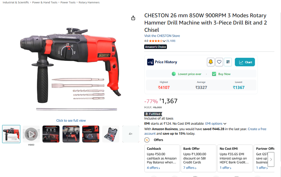 CHESTON 26 mm 850W 900RPM 3 Modes Rotary Hammer Drill Machine with 3-Piece Drill Bit and 2 Chisel.
