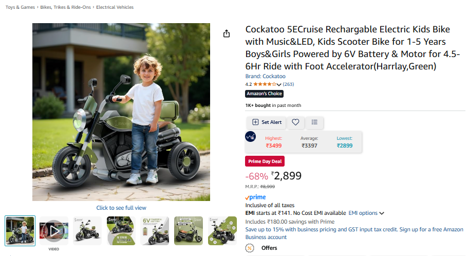 Cockatoo 5ECruise Rechargable Electric Kids Bike with Music&LED, Kids Scooter Bike for 1-5 Years Boys&Girls Powered by 6V Battery & Motor for 4.5-6Hr Ride with Foot Accelerator(Harrlay,Green)