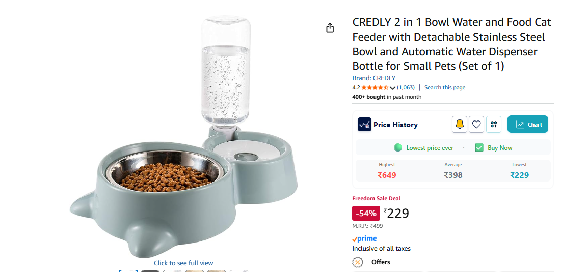 CREDLY 2 in 1 Bowl Water and Food Cat Feeder with Detachable Stainless Steel Bowl and Automatic Water Dispenser Bottle for Small Pets (Set of 1)