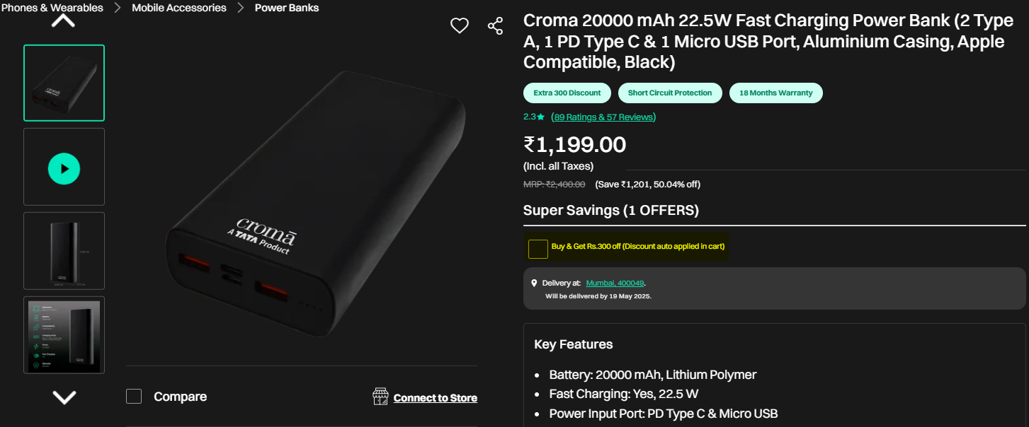 Croma 20000 mAh 22.5W Fast Charging Power Bank (2 Type A, 1 PD Type C & 1 Micro USB Port, Aluminium Casing, Apple Compatible, Black).