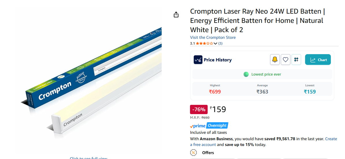 Crompton Laser Ray Neo 24W LED Batten | Energy Efficient Batten for Home | Natural White | Pack of 2.