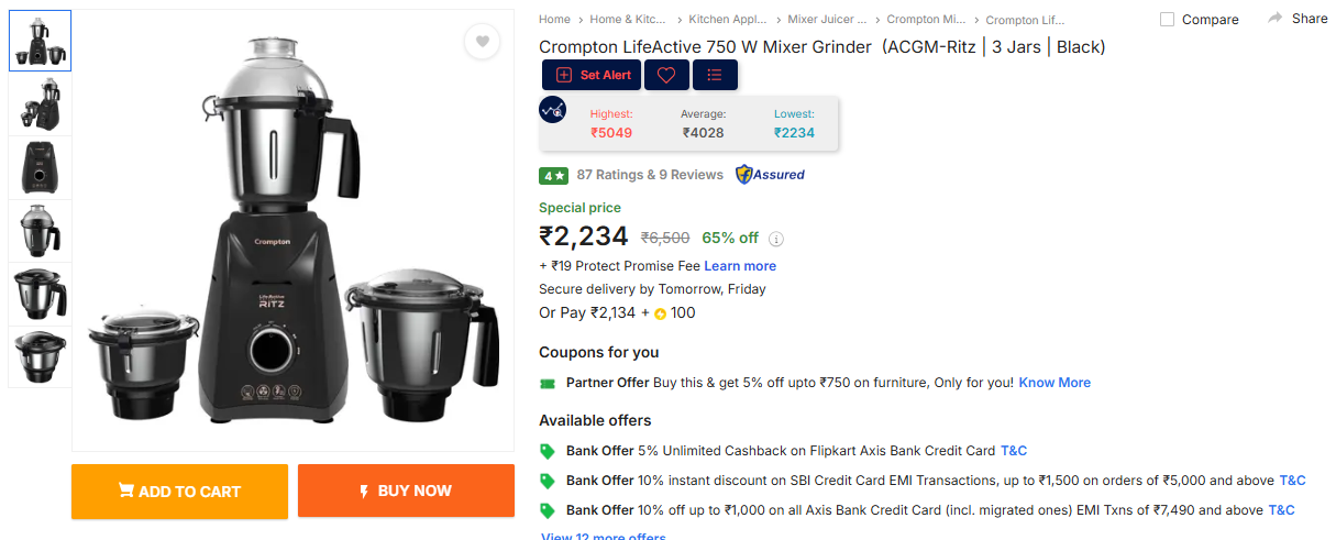 Crompton LifeActive 750 W Mixer Grinder (ACGM-Ritz | 3 Jars | Black).
